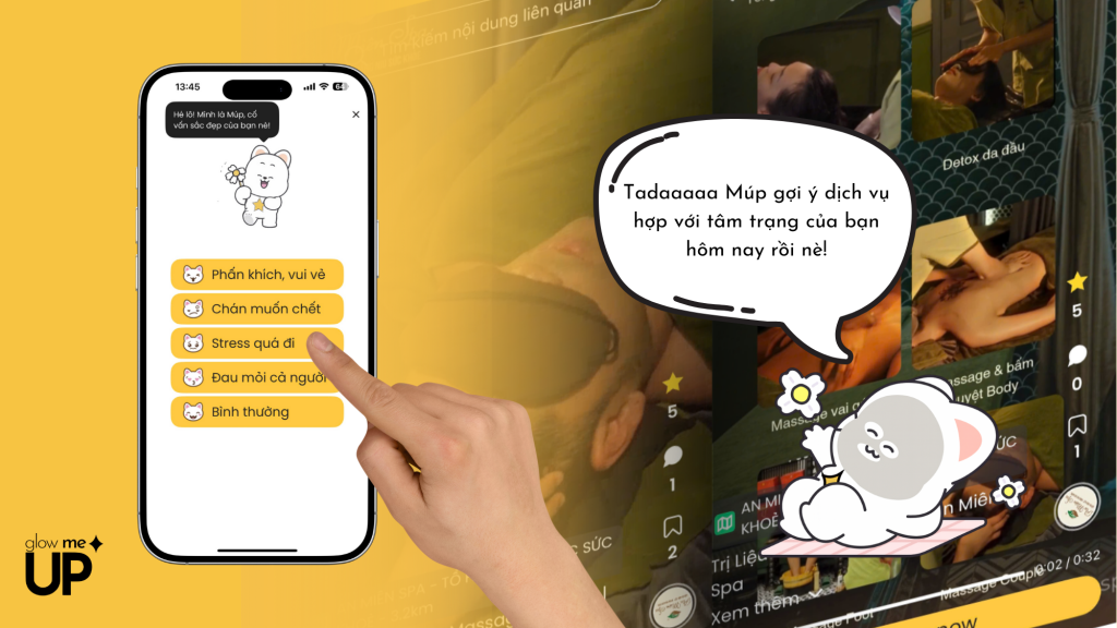 Múp hỏi thăm tâm trạng bạn mỗi ngày, gợi ý dịch vụ theo vibe và đôi khi còn “drama mèo” một chút để tạo cảm giác thân thiện. Chính yếu tố này giúp trải nghiệm làm đẹp trở nên nhẹ nhàng và thú vị hơn, thay vì khô khan như các ứng dụng công nghệ thông thường. Múp giúp GlowMeUp trở thành một nền tảng không chỉ thông minh mà còn có cảm xúc, đúng với tinh thần Beauty × AI × Emotion.